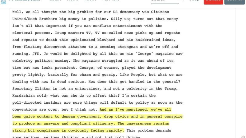 Hillary Clinton Podesta Emails Wikileak - Establishment Bureaucrats Plot to Keep Citizens Ignorant & Compliantnifty_nate10/10/16 6:38pmFiled to: Hillary Clintonjohn podestaPodesta EmailsWikileaksEditPromoteShare to KinjaGo to permalink ReplyLeave a reply